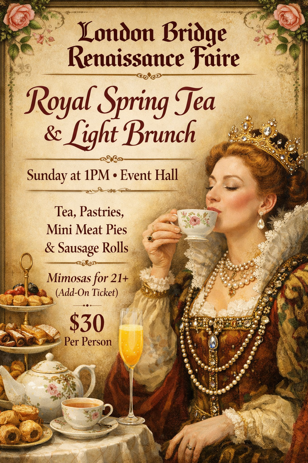 Step inside the Event Hall Tent for an enchanting Royal Spring Tea at the London Bridge Renaissance Faire — a refined gathering inspired by centuries of noble tradition and the beauty of spring.